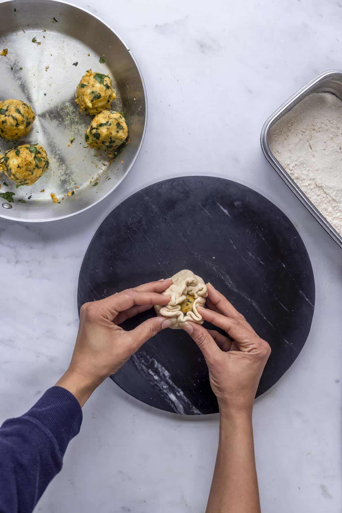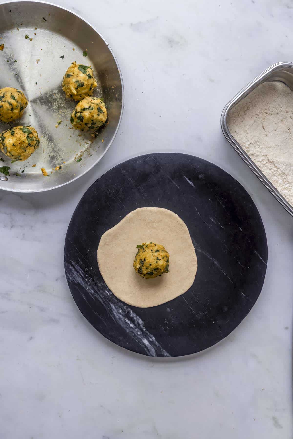 - Pick one ball, and roll it into a small disc of 2-3 inches. Fill 2 teaspoons of the potato methi stuffing. Bring the sides of the dough into the centre and pinch to seal the edges. Repeat the process for the remaining portions.