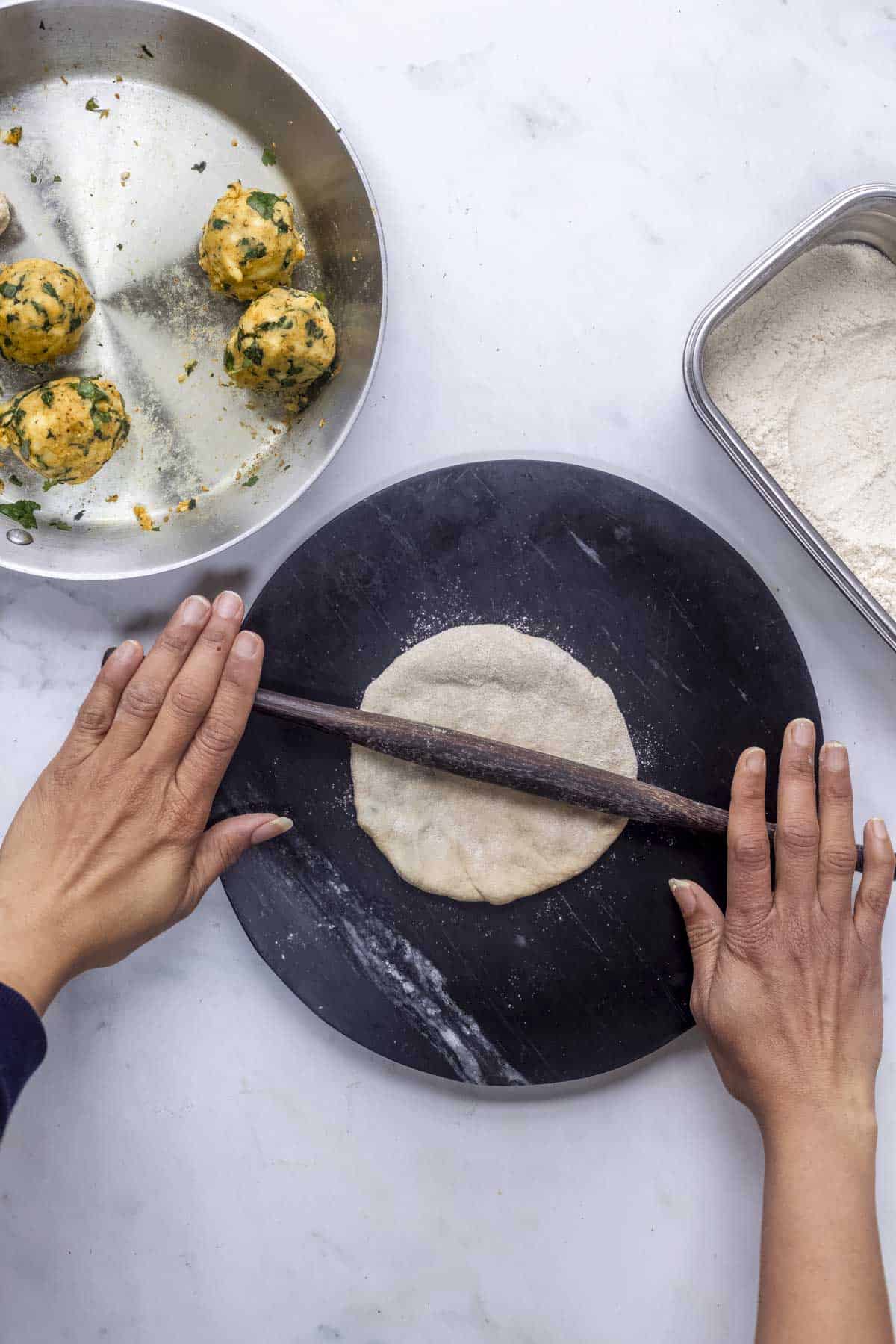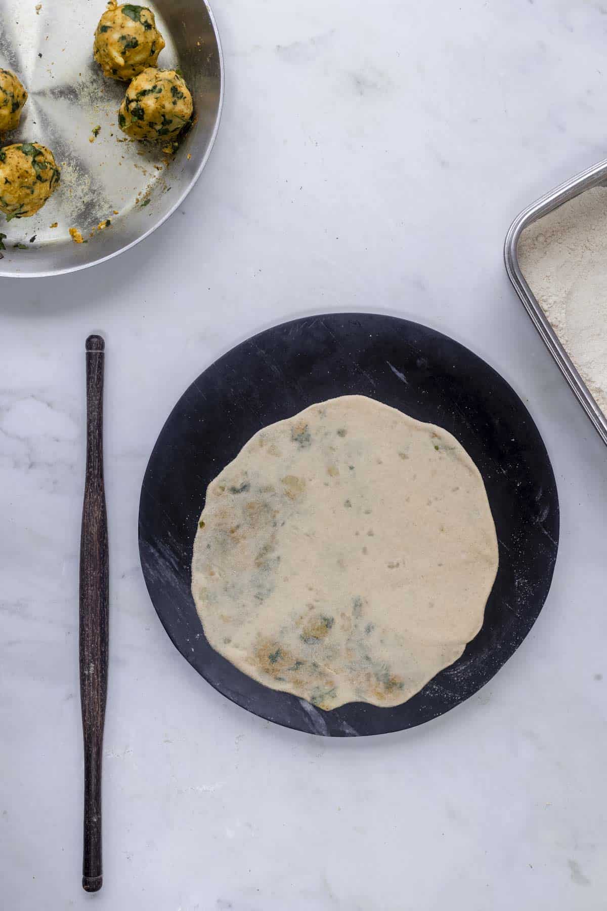 - Gently flatten the stuffed dough ball with your hands. Then dust in the flour and roll the dough into a 6-7 inch diameter with a rolling pin. While rolling, apply equal pressure to the dough and you will have a circle paratha.