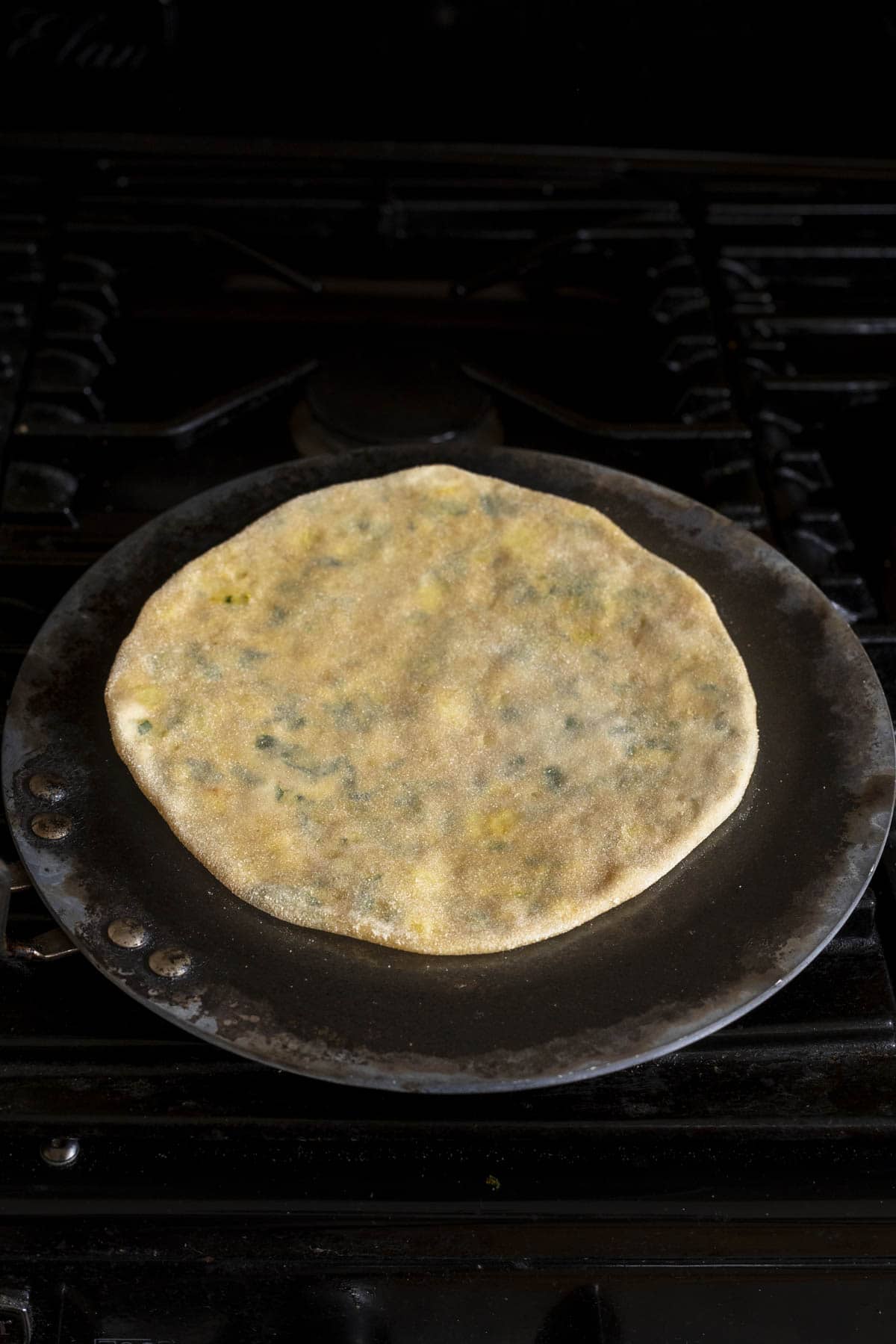 Heat a skillet (tawa) over high heat. Place the rolled paratha on the skillet.