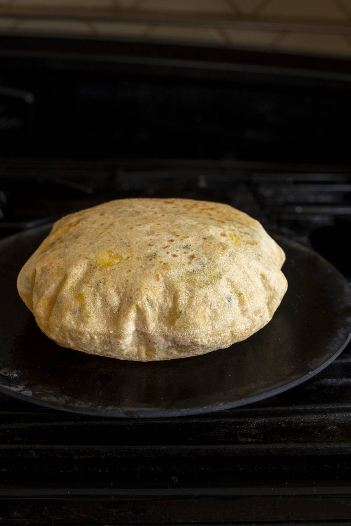 Drizzle ¼ teaspoon of oil or ghee, and continue cooking until golden brown spots appear. When the parathas are rolled evenly, they will puff well. You can also press with a flat spatula gently to ensure the cook well. Transfer to a casserole dish.