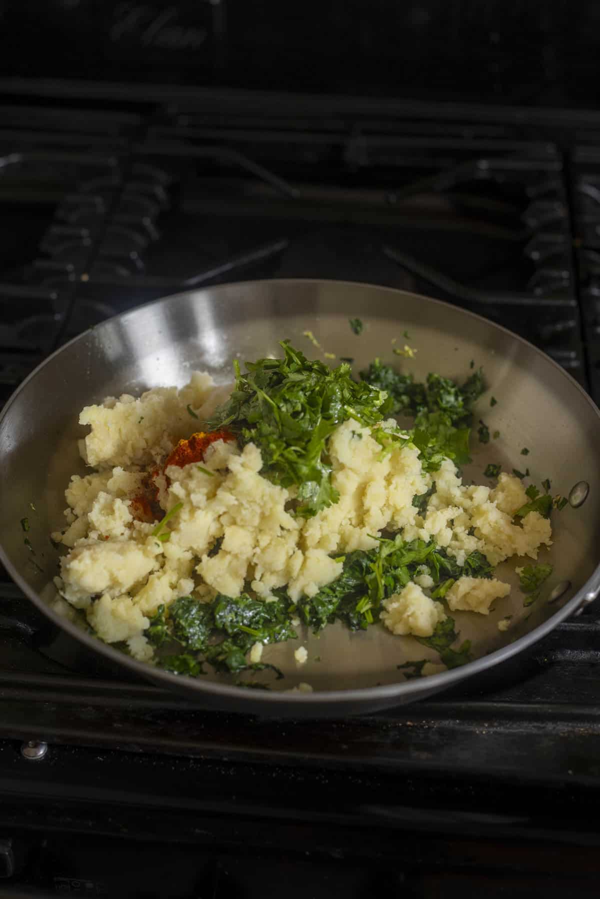 - Add mashed potatoes, coriander leaves, spices and salt. Combine together. Divide the mixture into 5-6 balls