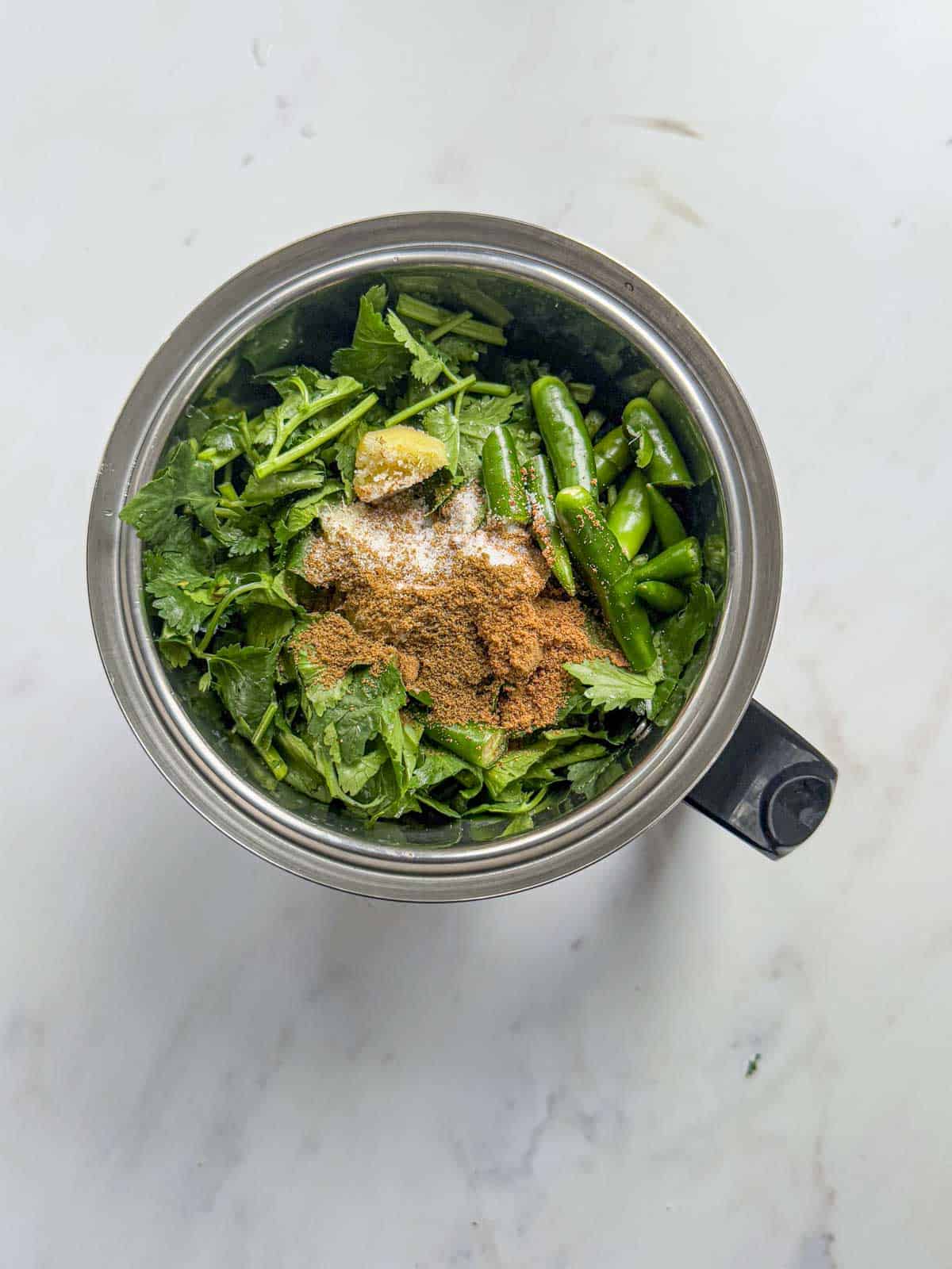 - Add the coriander leaves and stem, ginger, green chillies, chaat masala, cumin powder, salt, and water to a blender. Blend until smooth.
