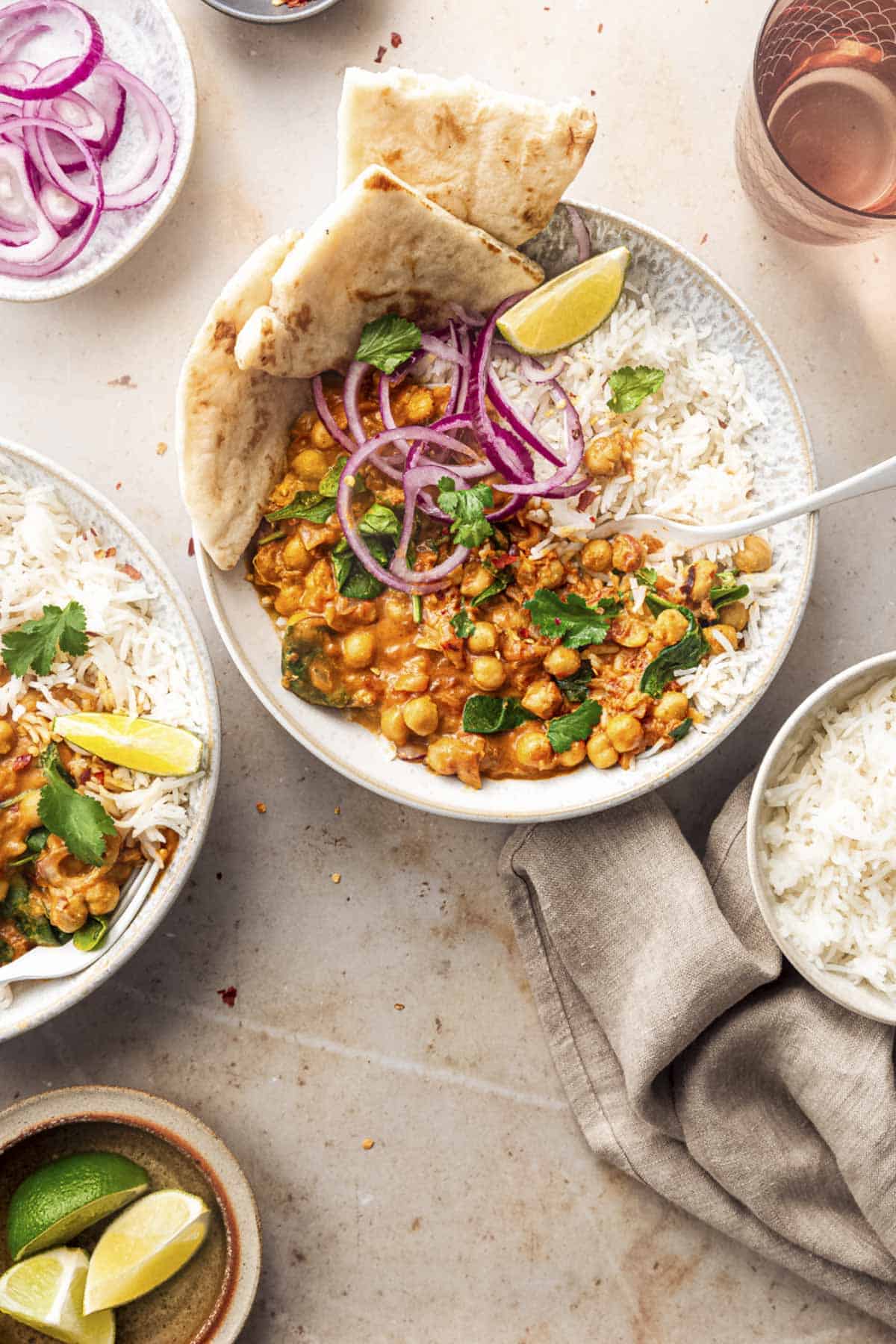 I love serving this vegan chickpea spinach curry with white basmati rice, cauliflower rice, quinoa, or yoghurt flatbreads like Homemade Naan bread or phulka roti.