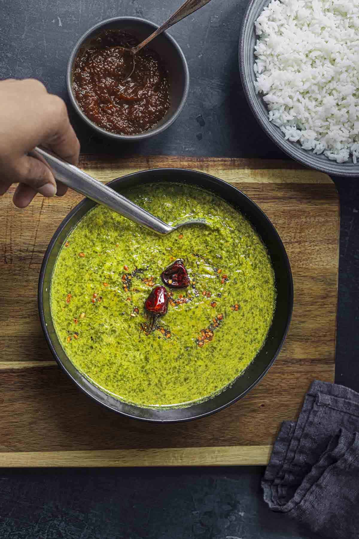- Chilli choice matters – The type of dried red chilli you use will affect the color of your molagootal. Milder chillies give a brighter green dish.