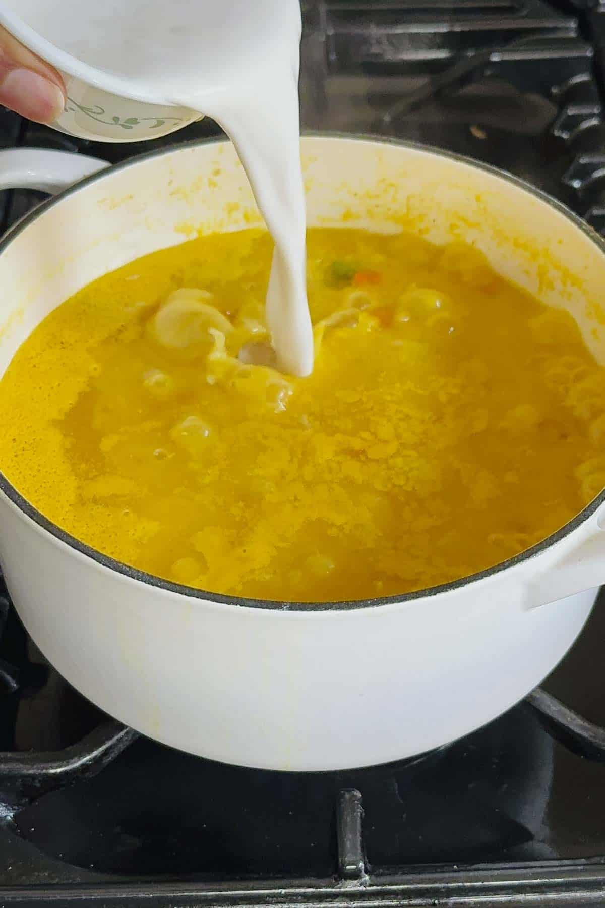 - Stir in coconut milk and cook for 5 more minutes. Decide on texture: for chunky soup, leave as is; for creamy, blend with immersion blender.½ can coconut milk