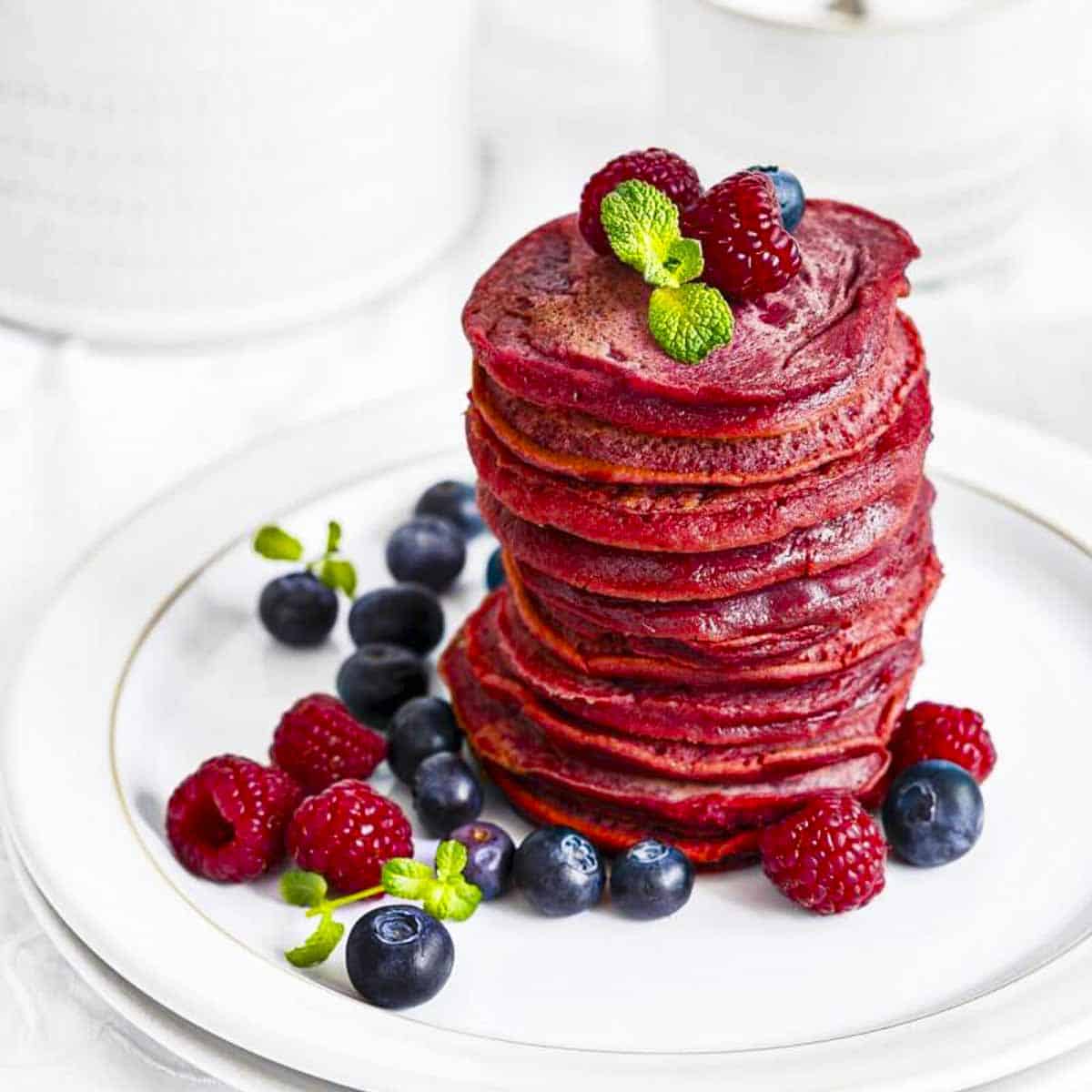The gorgeous color on these Red Velvet pancakes comes from a natural ingredient- Beetroot..