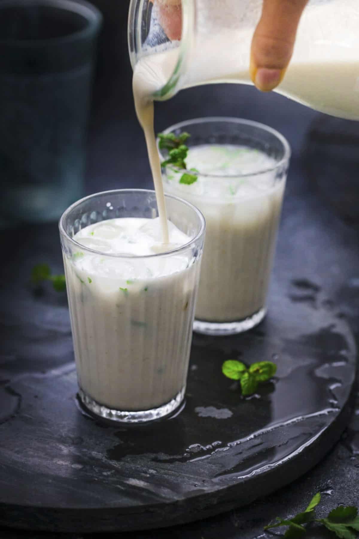- Pour into serving mugs. Garnish with a sprig of mint or coriander leaves & serve cold.Mint leaves or Coriander leaves
