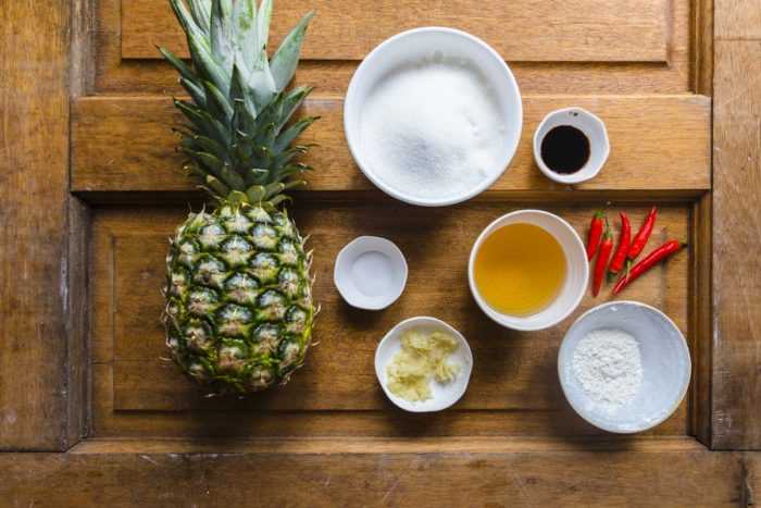For the pineapple chili sauce to look reddish, You can use chili sauce like sambal oelek. One other way is to use natural red food coloring made from beet or paprika. I have not used either in the recipe.